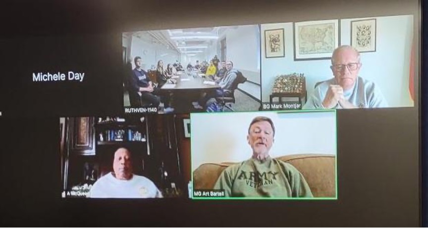 Wilson recruited officers to participate. He was greatly helped by retired Brig. Gen. Mark Montjar, who contacted several friends, who were also generals. An initial group of six generals and six field grade officers comprised the group. Maj. Gen. U.S. Army Joseph Marsiglia and several other officers from the Army, Navy and Air Force attended in person. ROA-MI Executive Committee members and Naval officers Capt. Ventz Potochik and Cmdr. Jim Semerad took part. As several of the officers lived far from Ann Arbor, they were linked to the meetings via Zoom. The officers provided copies of their military bios. Goldstein provided the UM meeting rooms, Zoom meeting administration, and coordination with the cadets.