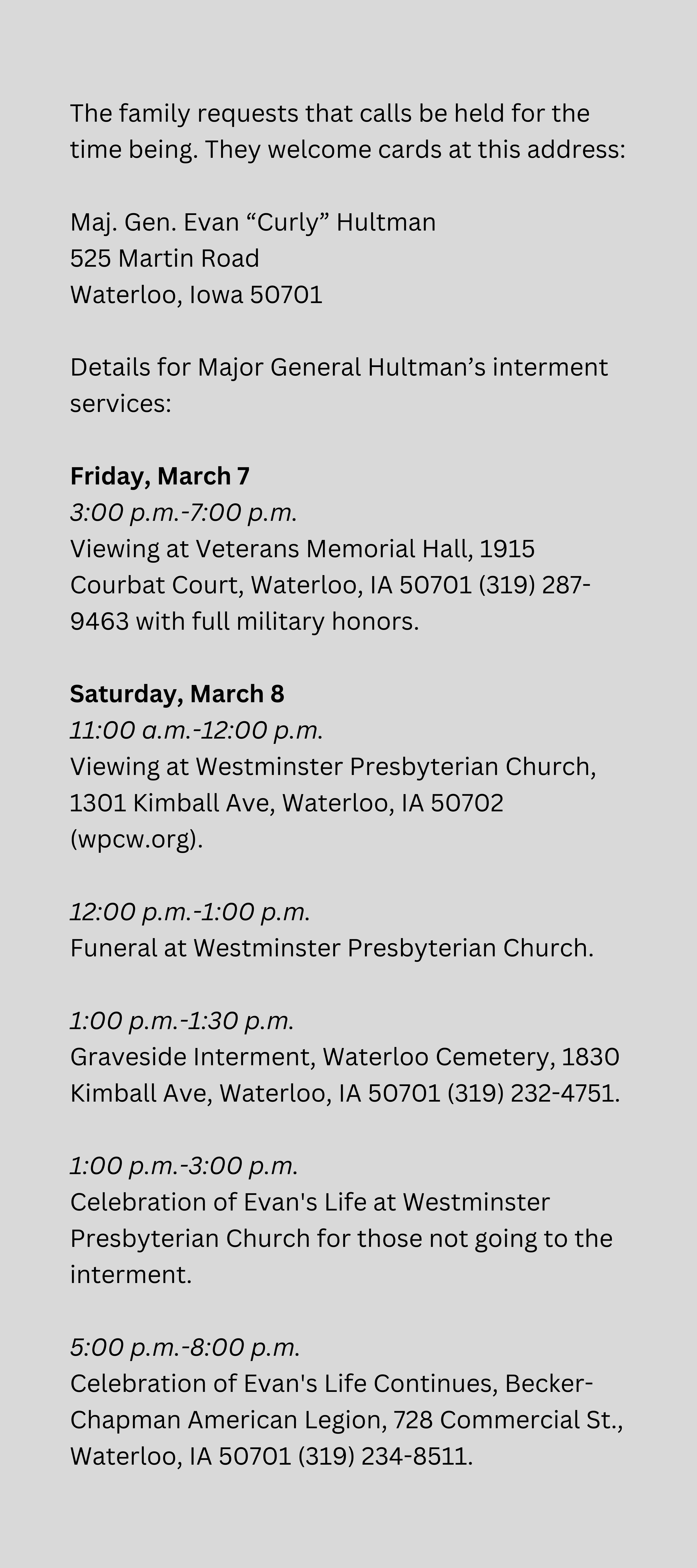 His was a life well led, and an inspiration to us all. Thank you, Maj. Gen. Evan L. “Curly” Hultman. May your towering and loving spirit find peace in God’s grace.